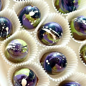 White Chocolate, Banana, Grape, and Bubblegum Ganache covered in a White Chocolate Shell