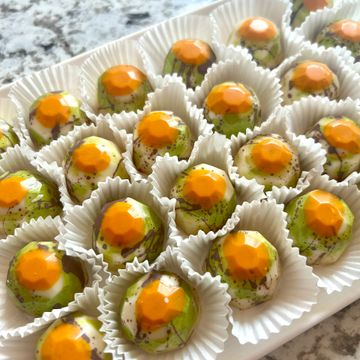 White Chocolate Nova Scotian Egg Nog ganache wrapped in a White Chocolate Shell